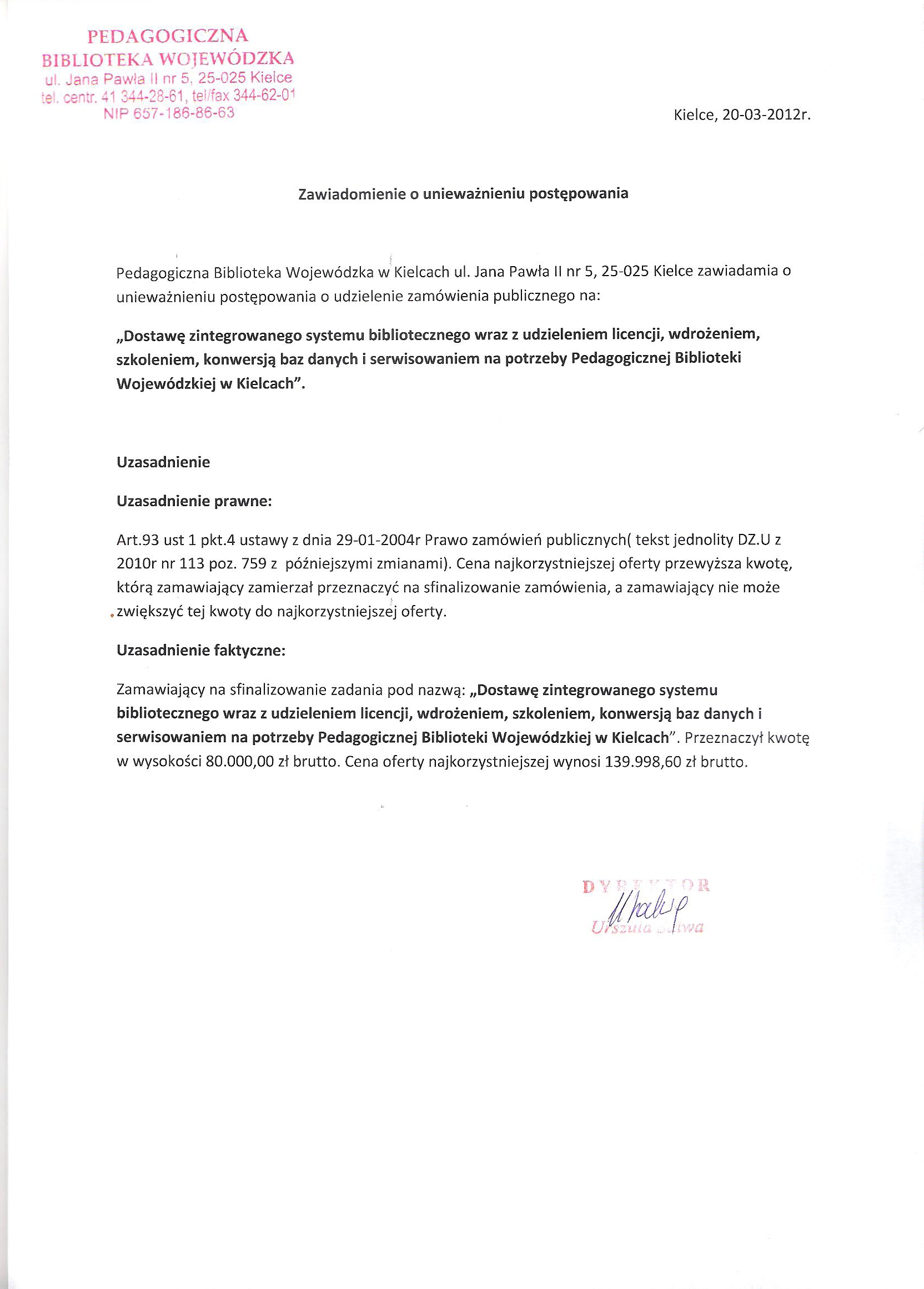PB-1/220/191/12 - Dostawa zintegrowanego systemu bibliotecznego wraz z udzieleniem licencji, instalacją, wdrożenie , szkoleniem, konwersją baz danych i serwisowaniem na potrzeb Pedagogicznej Biblioteki Wojewódzkiej w Kielcach